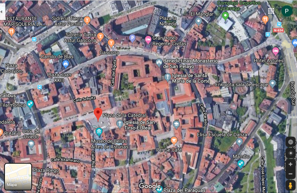 Ahora iremos hasta la plaza de la catedral y veremos en ella la Audiencia, donde trabajaba el Magistral, el el casino donde se produce la puesta de largo de la Regenta, la ya nombrada catedral, en la que se encontraba la capilla del Magistral y la iglesia de San Tirso el Real, que veremos aquí en ese mismo orden.